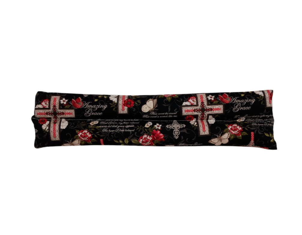 This lower lumbar pillow features Amazing Grace and has a soft red flannel on the back. This particular style of therapy pack was requested by my chiropractor as well as several local customers that have neck pain and wanted something that was more supportive. I also use it in the car as my degenerative discs make it hard for me to sit properly for long drives. It gives me more support along the right side of my lower back.